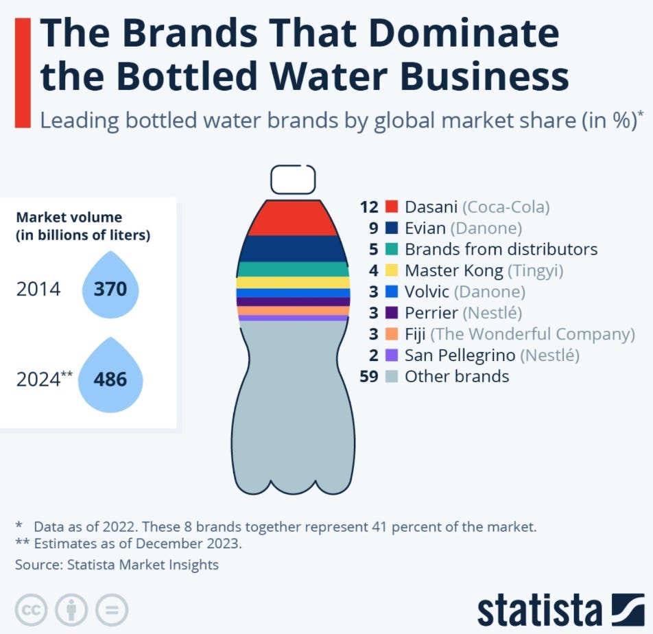 To the extent that one may trust studies that do not present their methodology, this figure offers some interesting data (https://www.statista.com/chart/31772/leading-bottled-water-brands-by-global-market-share/). First, the largest producers add up to 41%, while the rest is a plethora of thousands of brands and producers across the globe. Do scholars know enough about them? Are they different from the brands owned by the big four actors - Nestle, Danone, Pepsi and Coca-Cola? Second, private, “discount” water bottlers who produce purified water for supermarkets (Costo in the US, Kaufland in Europe), retailers (Seven-Eleven), even organizers, sport businesses (such the Yankees) – rose significantly, representing altogether five percent of the total production.